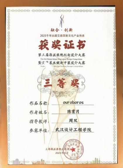2025年10月12日,第三届海派旗袍创新设计大赛暨艾德莱丝绸新中装设计大赛总决赛在上海工程技术大学产教融合大楼隆重举行。我院学子陈霄月在此次大赛中荣获三等奖,并受邀携其作品《ouroboros》系列亮相上海时装周,为我校赢得了极高的荣誉,展现了我校学子卓越的专业素养与创新精神。
