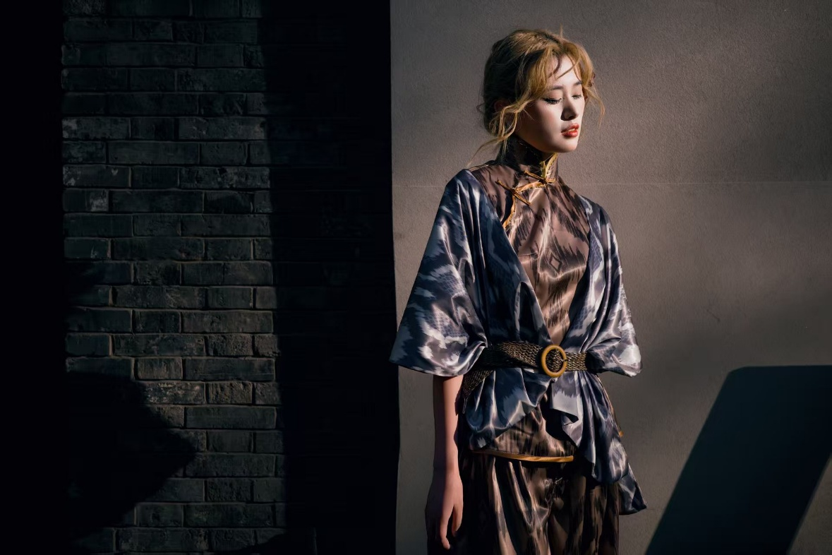 陈霄月同学的获奖作品《ouroboros》系列服装灵感来源于古老符号“衔尾蛇”,象征衔尾之环,生生不息。该系列作品将海派旗袍的精致裁剪与新疆艾德莱斯绸的流光溢彩完美相融,运用蛇的花纹与艾德莱斯工艺,颜色取自喀什的古城与戈壁滩,与海派旗袍相结合。厚重底蕴如同巨蟒脱壳一般蜕变,迎来新生。作品整体象征蜕变、新生与跨越,契合了喀什与上海、传统与现代、沙漠与都市的交融主题,展现了我校学子对传统文化的深刻理解和创新表达。