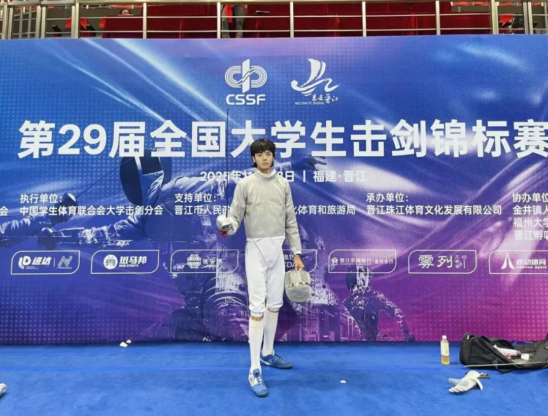11月2日至8日,第29届全国大学生击剑锦标赛在福建晋江圆满落幕。作为国内高校击剑领域级别最高、规模最大、影响力最广的顶级赛事,本届大赛汇聚了全国近百所高校的1000余名顶尖选手同台竞技。武汉设计工程学院时尚设计学院2025级表演(服饰表演与推广)专业新生程建奎,代表学校出征此次赛事,凭借扎实的技术功底、沉稳的战术素养一路过关斩将,最终跻身赛事十六强,成为校园中兼具专业风采与竞技精神的青春楷模。