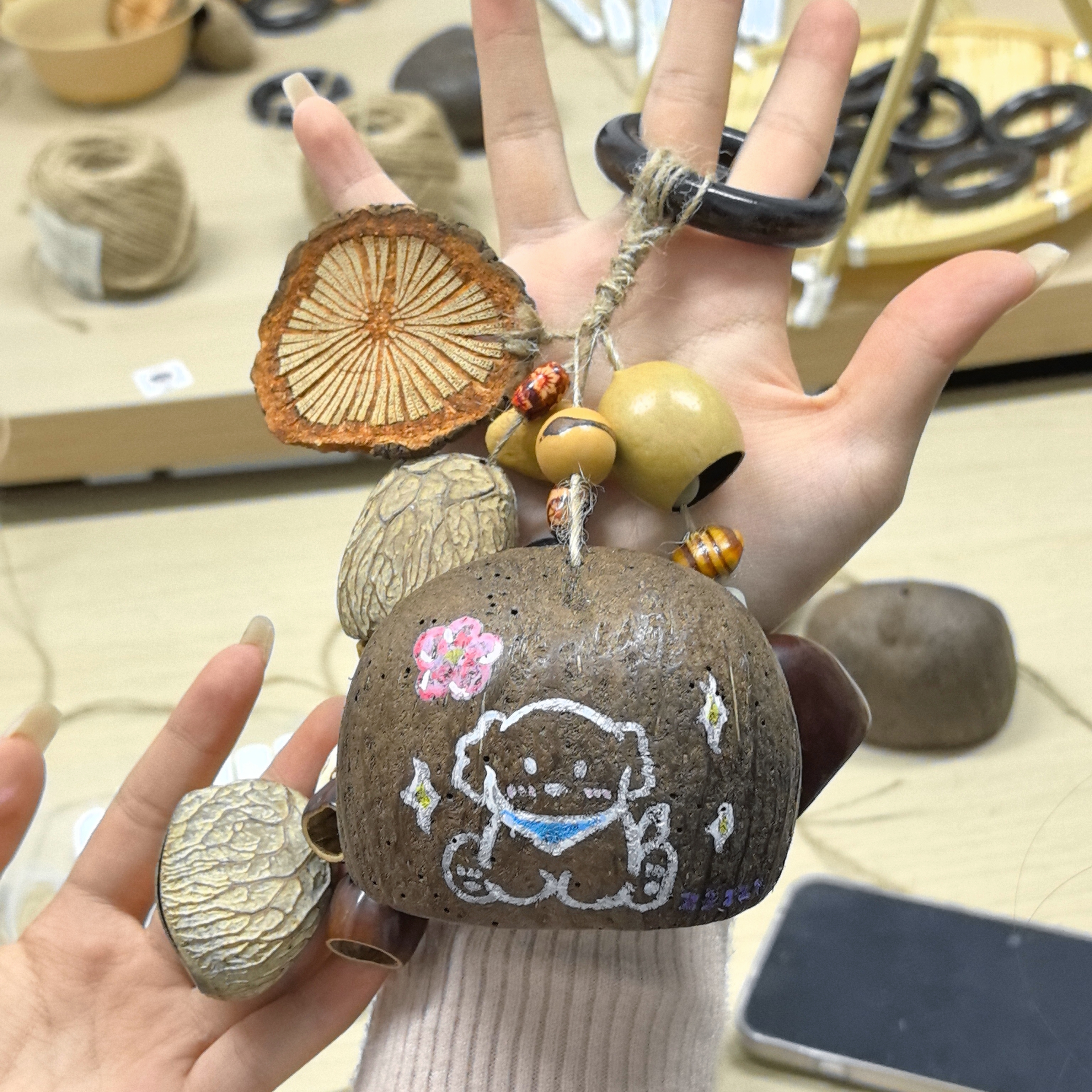 当同学们涌入现场,面对琳琅满目的材料,便一个个化身为“自然设计师”:有人偏爱印尼果的粗糙纹理,将它与血藤片搭配,让厚重与轻薄的质感碰撞;有人钟情菩提珠的禅意,串起一串带着佛系气息的摇铃;还有人脑洞大开,把水玲铜与夹竹桃果组合,期待它摇出“雨铃叮咚”的脆响……挑选、串连、创意摆放,大家的手指在果壳间穿梭,让这些原本散落的自然零件,在麻绳的牵引下有了全新的生命。
