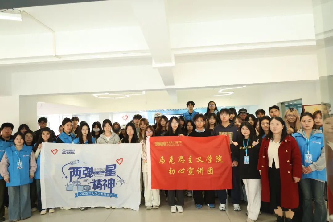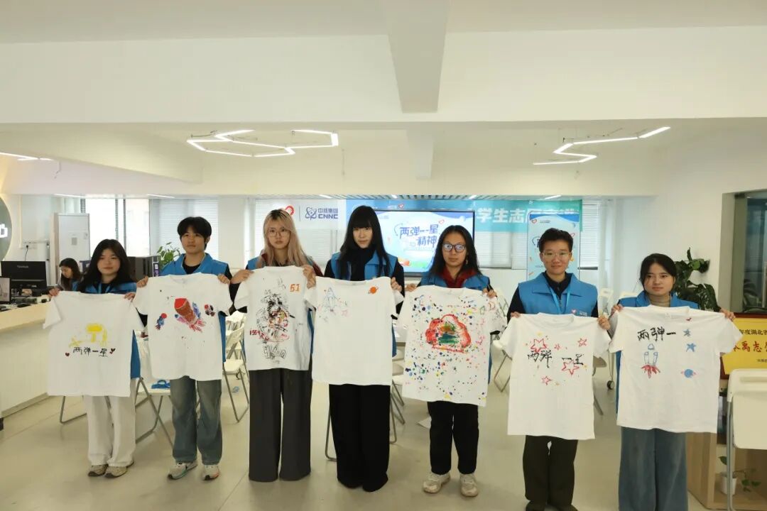 最终,全体师生手持创意作品合影留念,镜头定格下青春笑脸与创意T恤相映生辉的瞬间,为这场科技、精神与设计的精彩碰撞画上了圆满的句号。这场活动不仅深化了同学们对“两弹一星”精神的理解,更开创了红色精神传承与专业实践相结合的新路径,实现了思想政治教育与专业教育的双向赋能、同向同行。