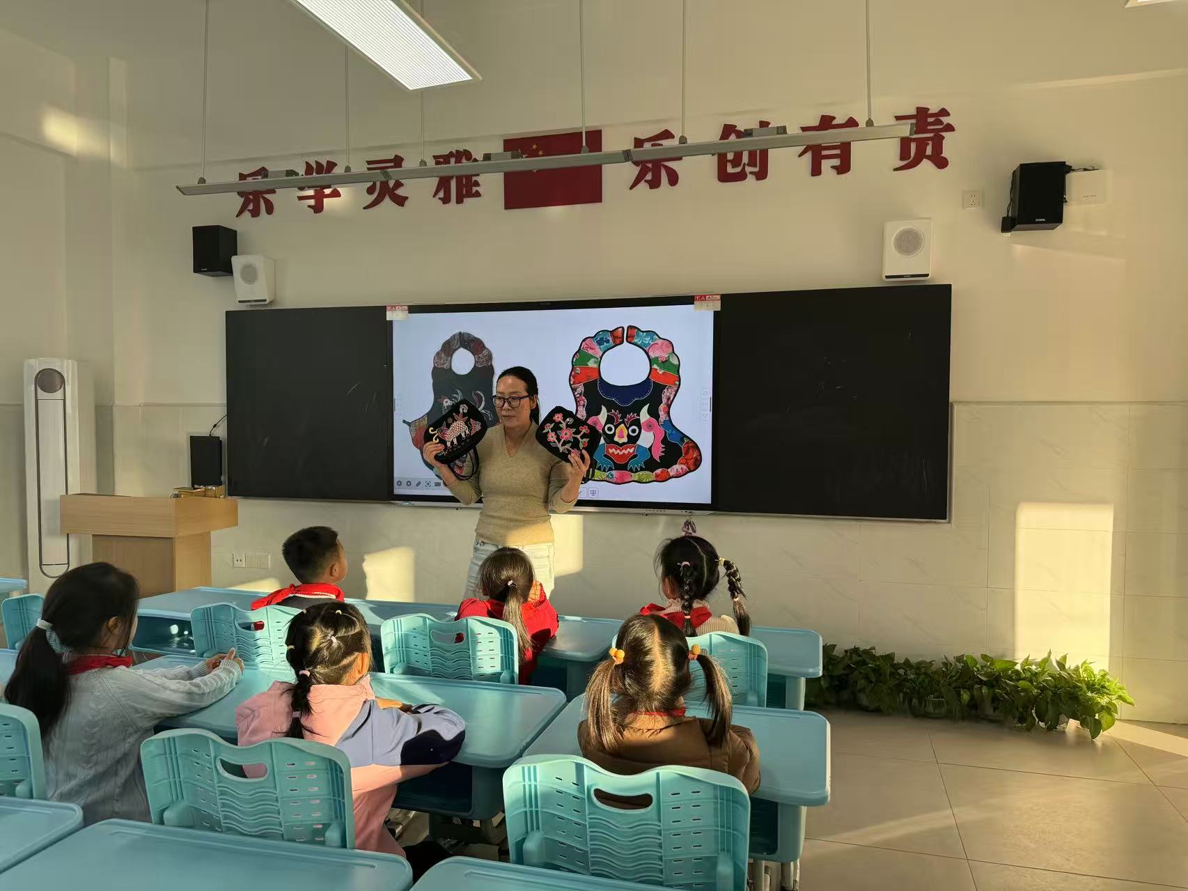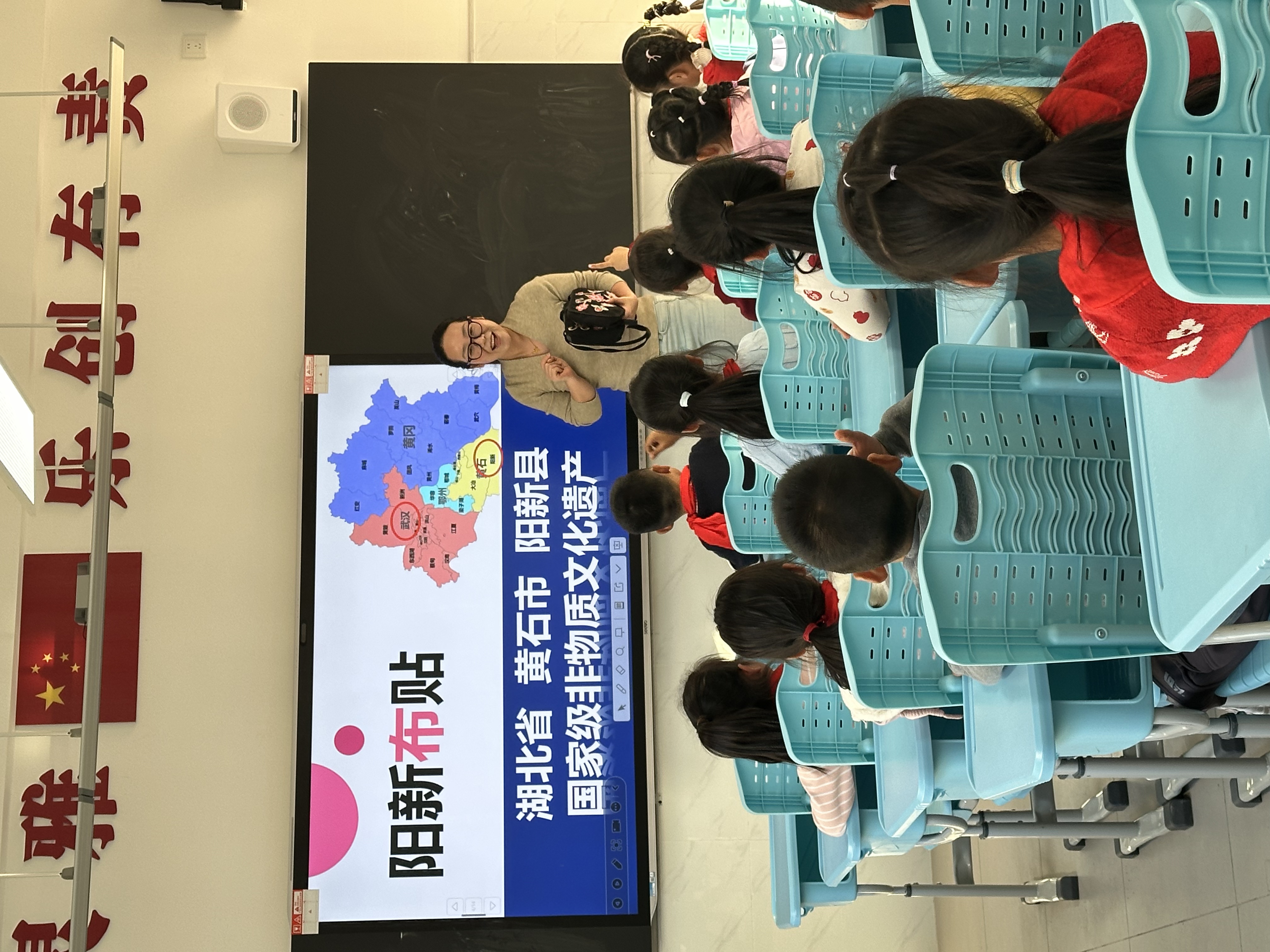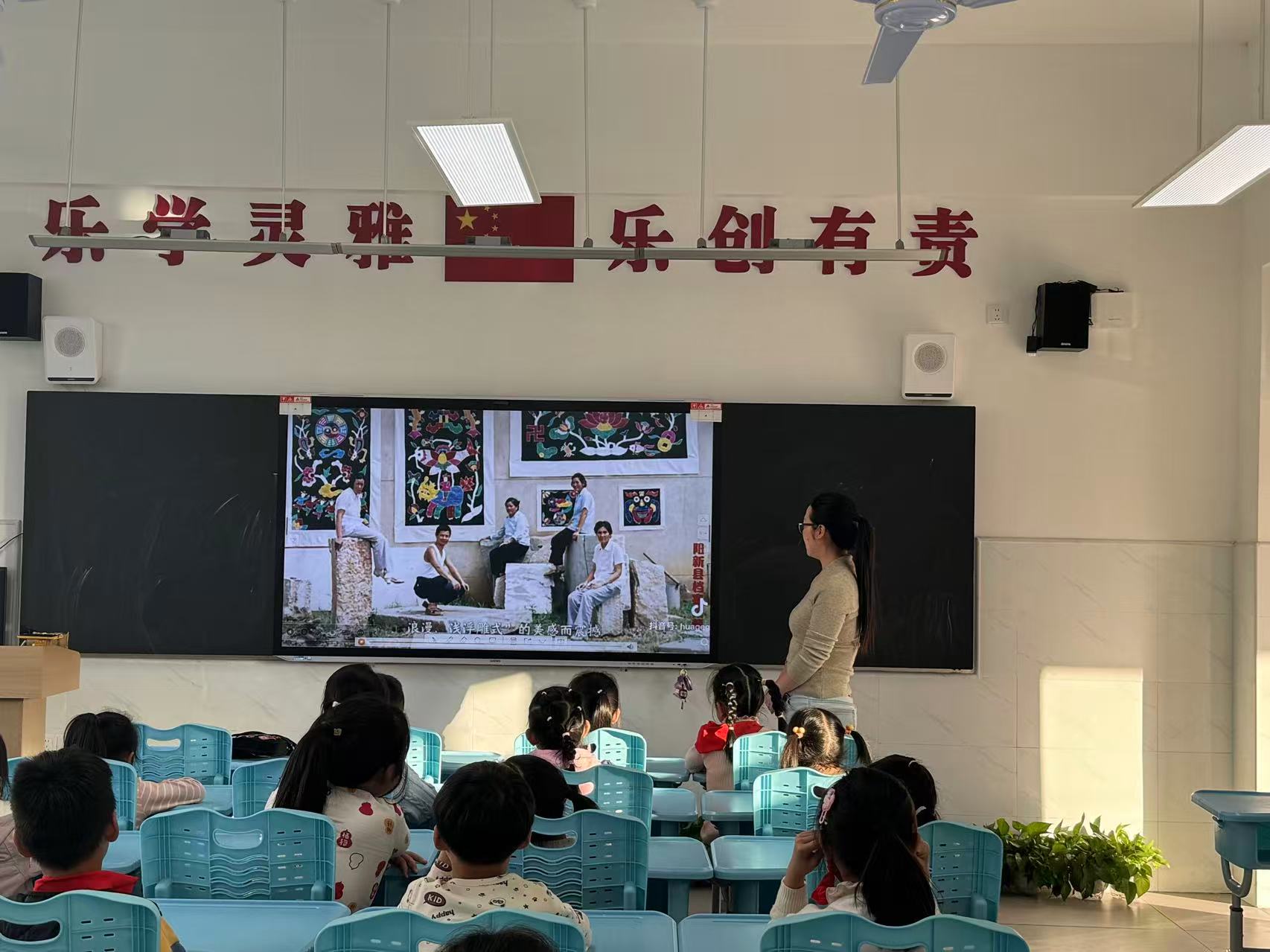 “小朋友们,你们知道吗?早在明清时期,阳新地区的妇女就会用碎布拼贴出肚兜、围裙上的图案,后来这种技艺慢慢发展成了现在的阳新布贴。” 胡老师一边展示PPT的经典布贴作品,一边用通俗易懂的语言讲解布贴创作中 “剪、拼、贴、缝”的核心步骤,孩子们的目光瞬间被课件上色彩鲜艳、造型生动的布贴作品吸引,纷纷举手提问:“老师,我能做一个小兔子形状的布贴吗?”“我看到这些布拼成的是一个山羊,对吗?”现场互动氛围十分热烈。