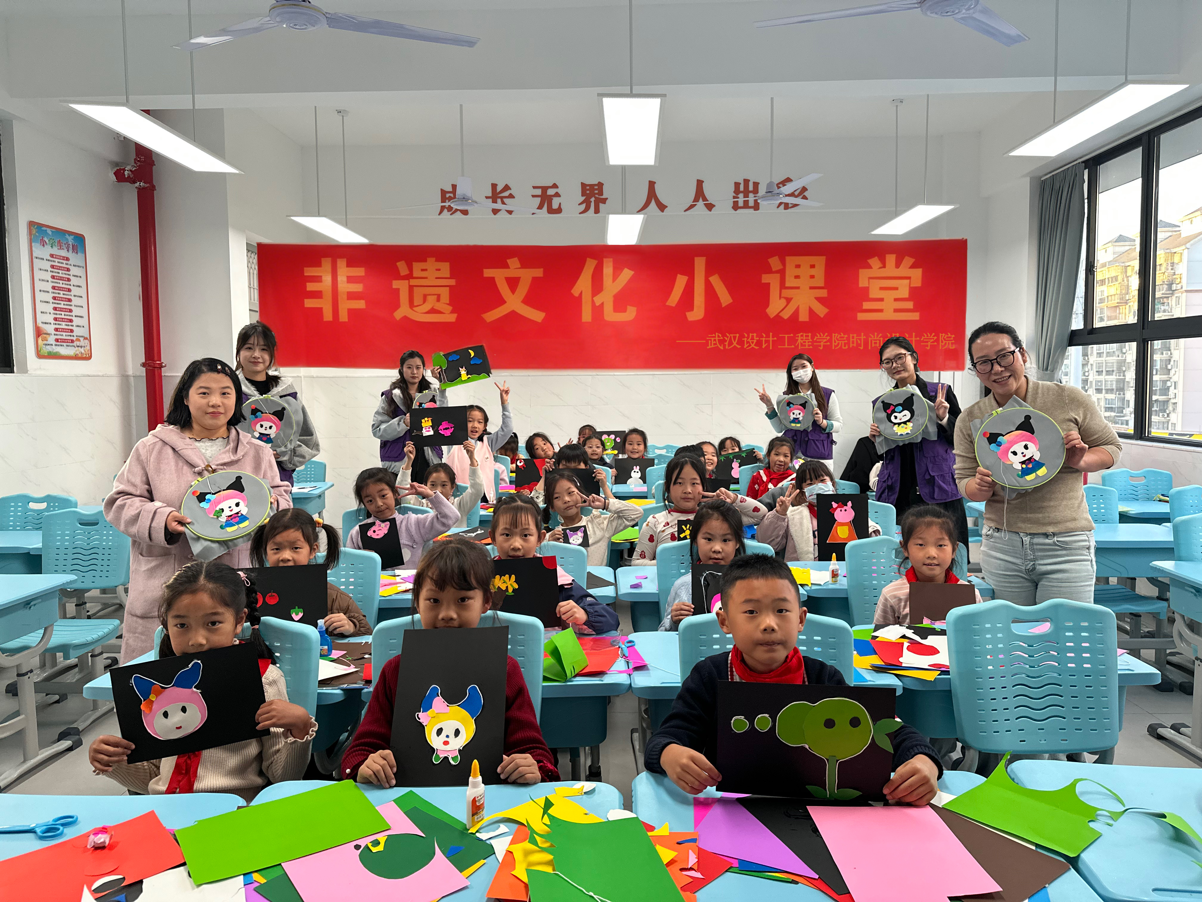 为进一步推动非物质文化遗产的传承与普及,让传统文化在青少年心中扎根发芽,11月26日,武汉设计工程学院非遗研究中心副主任胡舒娟、辅导员荣嘉奇带队,组织学生志愿者团队赴武汉市洪山实验小学,开展了一场以“布可思议,贴出精彩”为主题的阳新布贴文化小课堂活动。本次活动通过生动有趣的教学与实践,让孩子们近距离感受非遗文化的独特魅力,在欢声笑语中开启了一场别开生面的传统文化之旅。