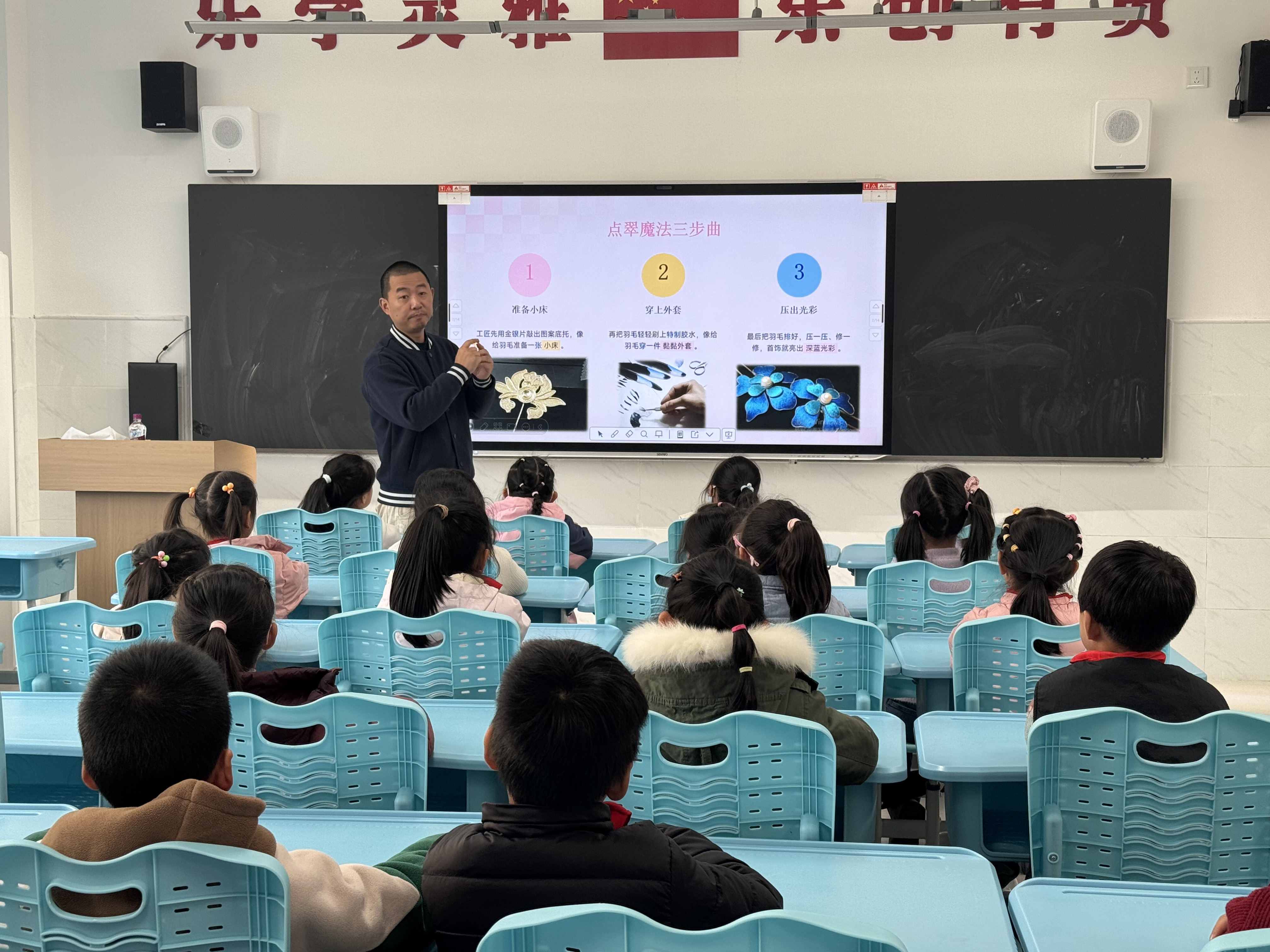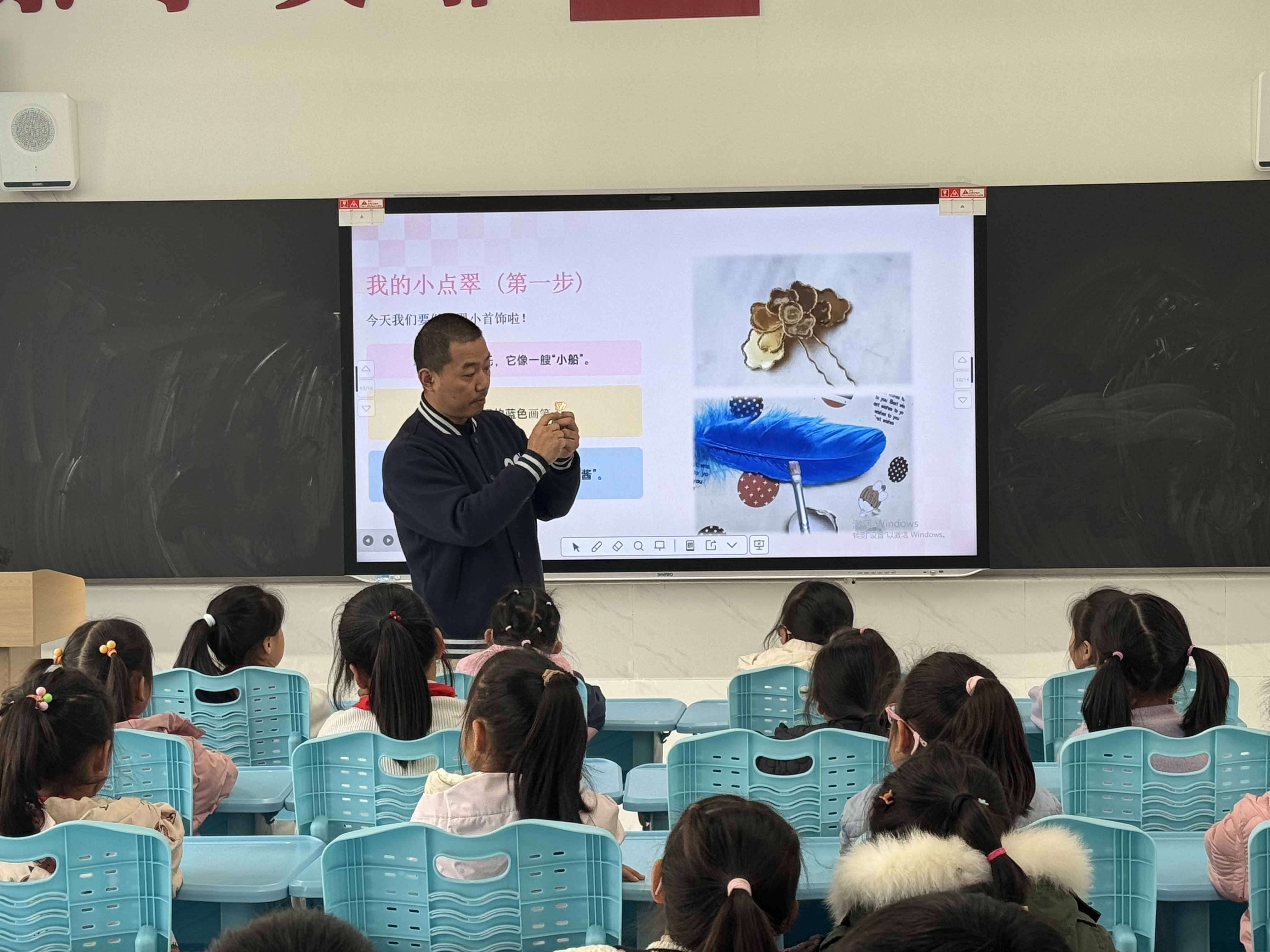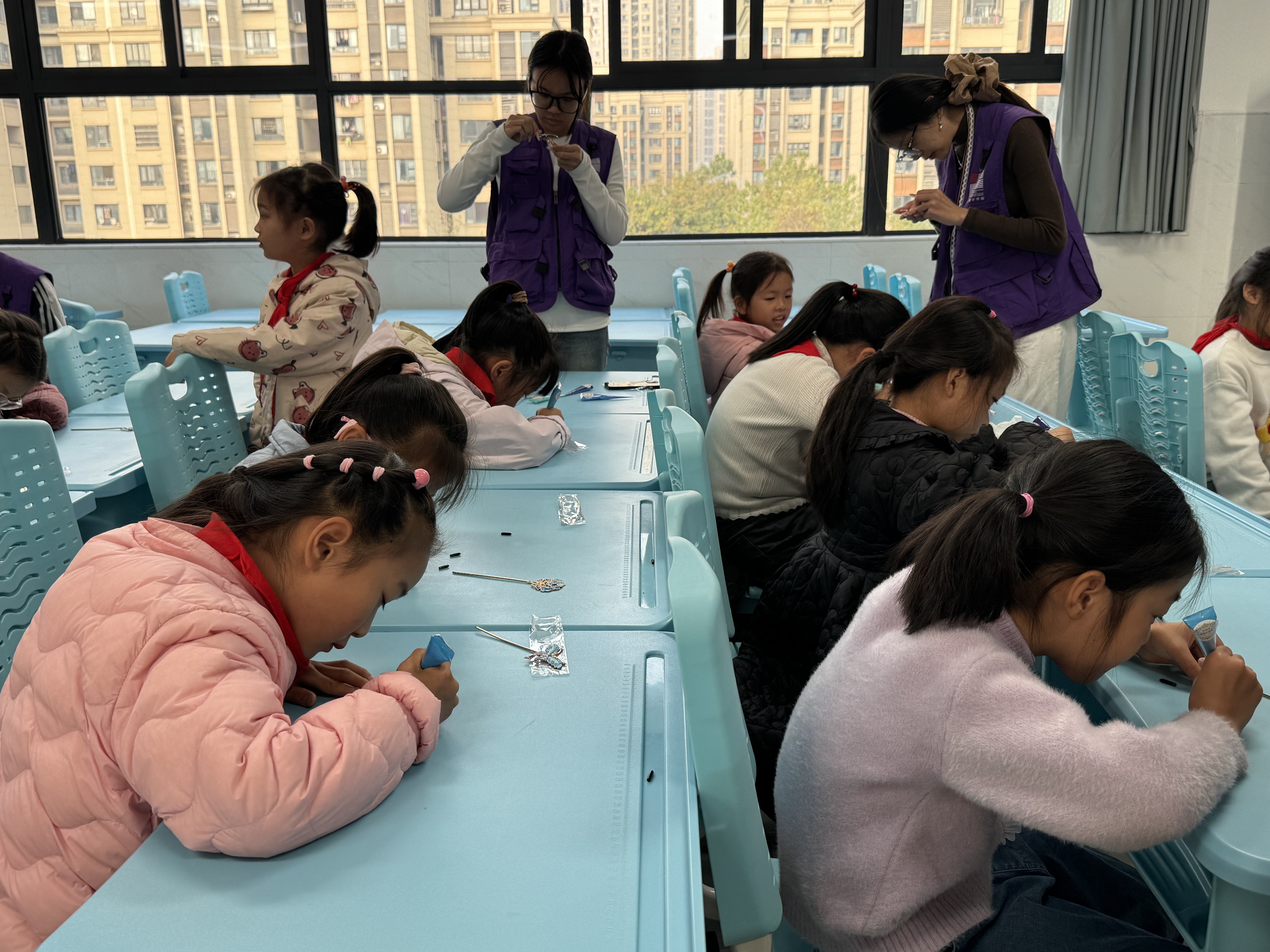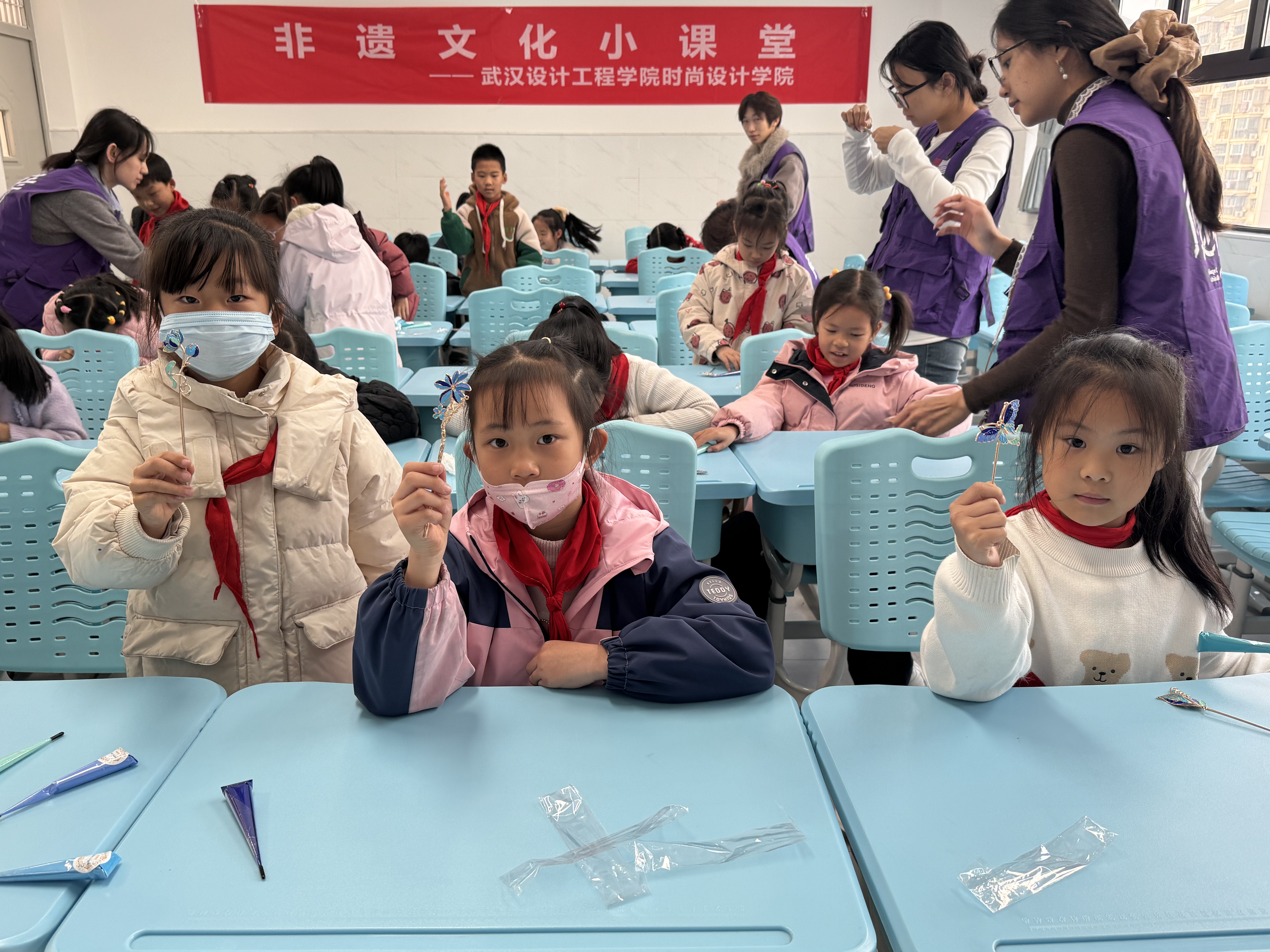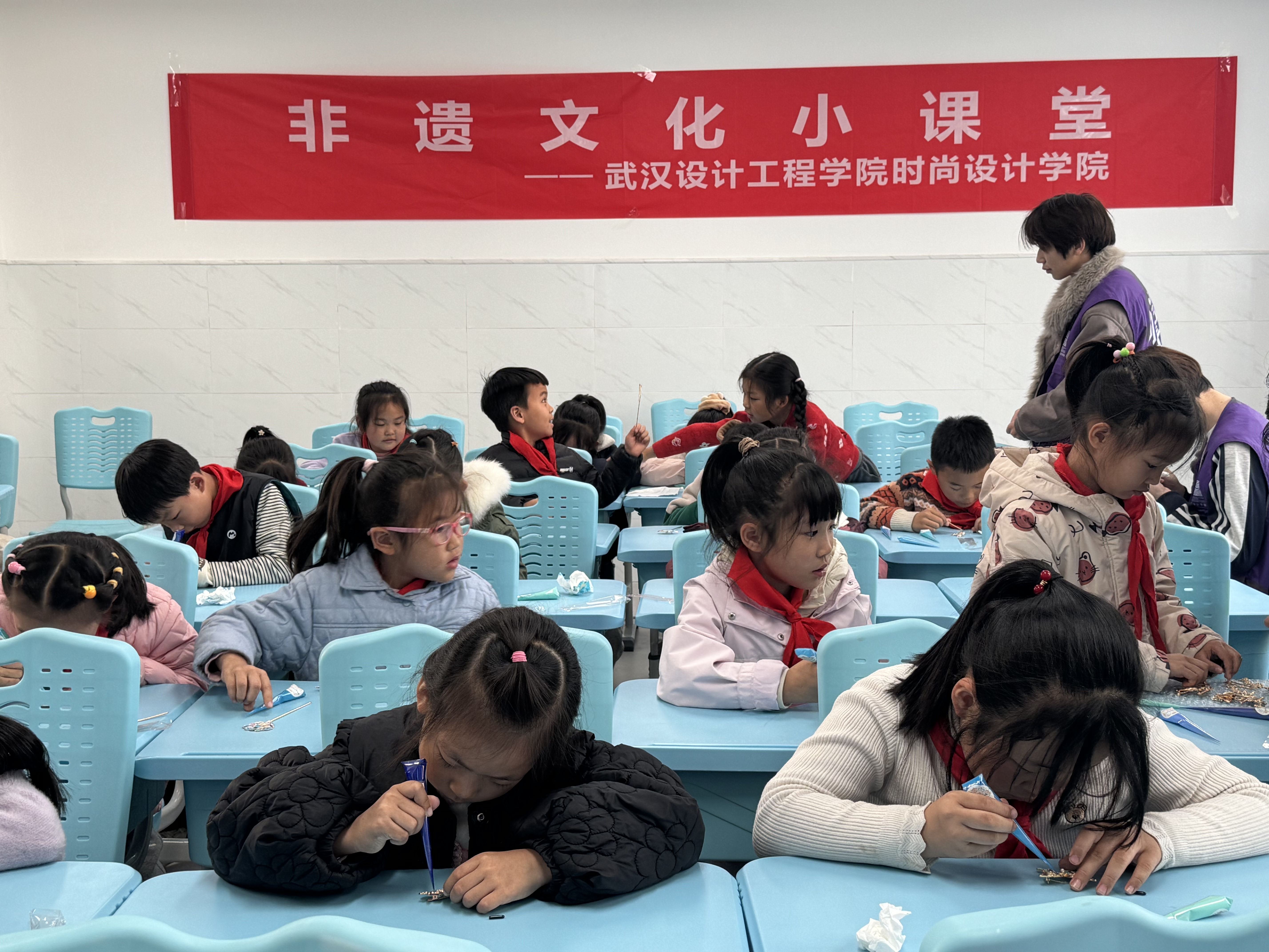 为传承中华优秀非遗文化,让青少年近距离感受传统工艺的独特魅力,12月10日,时尚设计学院时尚设计系副主任刘斌、辅导员荣嘉奇带队,组织学生志愿者团队走进武汉市洪山实验小学实,开展了一场以“小小非遗守护者,点翠羽毛的魔法”为主题的点翠工艺体验小课堂。