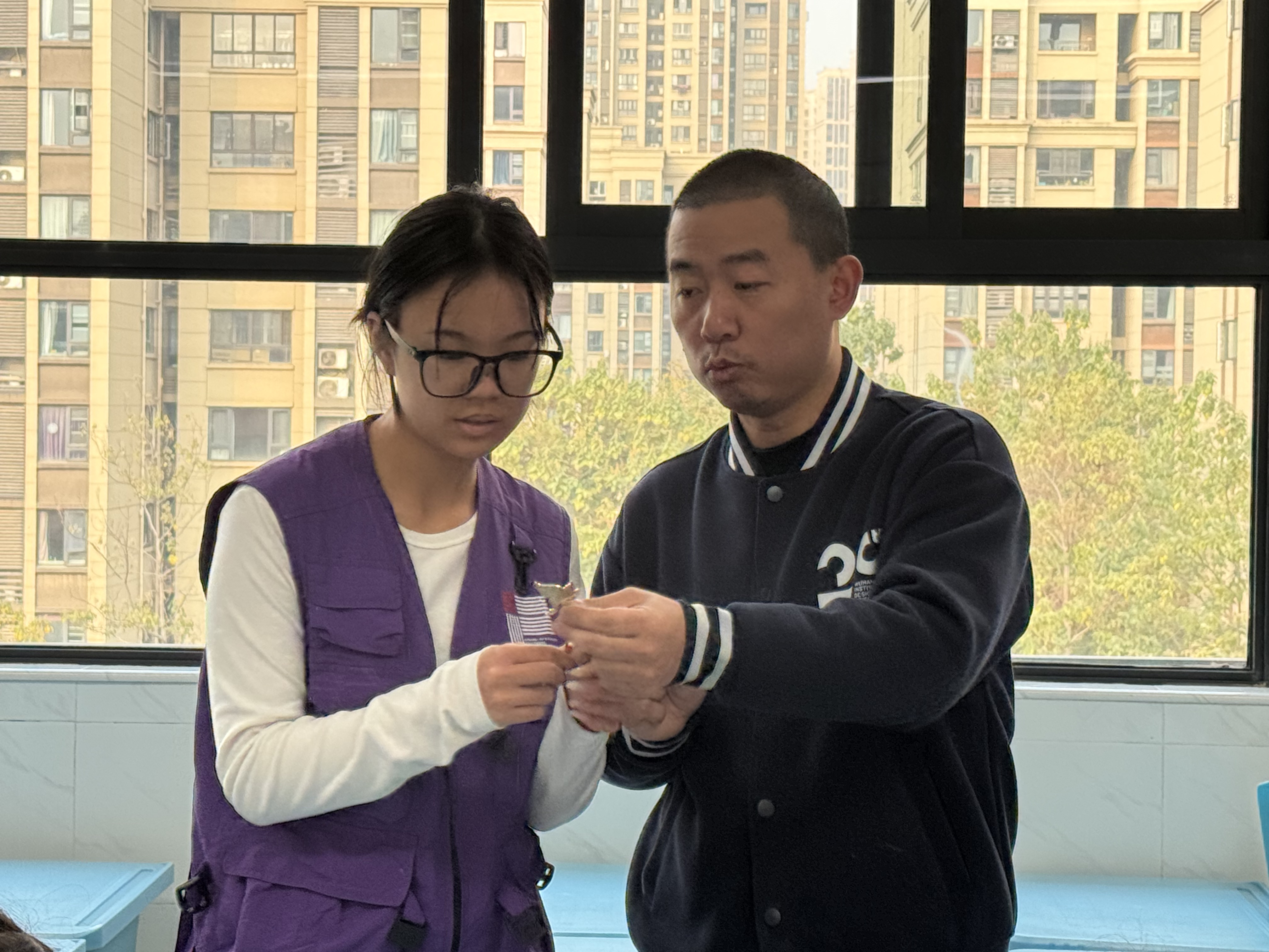 实践环节中,同学们兴致勃勃地投入创作,大家围绕发簪、胸针、发卡等常见饰品样式进行挑选,展开设计。志愿者们穿梭在课桌之间,耐心指导大家调色、晕染,还协助大家完成饰品基底的细节操作,及时纠正不规范的手法。“老师,这个颜色怎么搭配才能更像翠羽呀?”“我想做一个点翠发簪回家送给妈妈,可以帮我看看吗?”“我的胸针这样画好看吗?”课堂上,提问声、讨论声此起彼伏。有的同学专注于色彩搭配,力求还原传统点翠的艳丽;有的同学大胆创新,在发簪、发卡的底托上融入各种色彩元素,让非遗作品焕发童趣。
