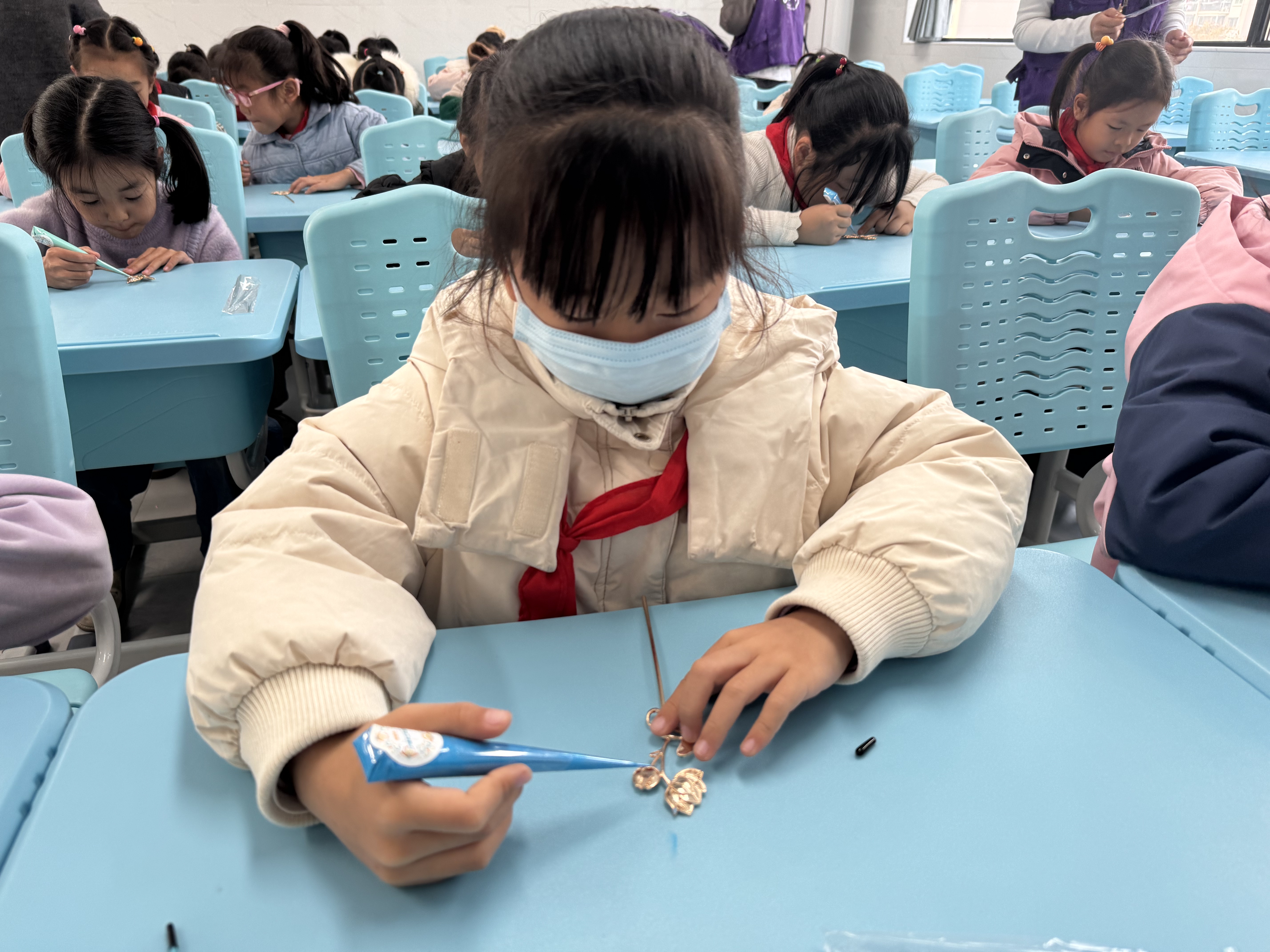 经过一个多小时的创作,一件件色彩鲜亮、造型精巧的“颜料点翠”发簪、胸针、发卡新鲜出炉,同学们纷纷举起自己的作品展示,脸上洋溢着满满的成就感。“原来非遗工艺这么有趣,用颜料也能画出这么漂亮的点翠作品!”二年级同学李雨桐拿着自己的创作兴奋地说。