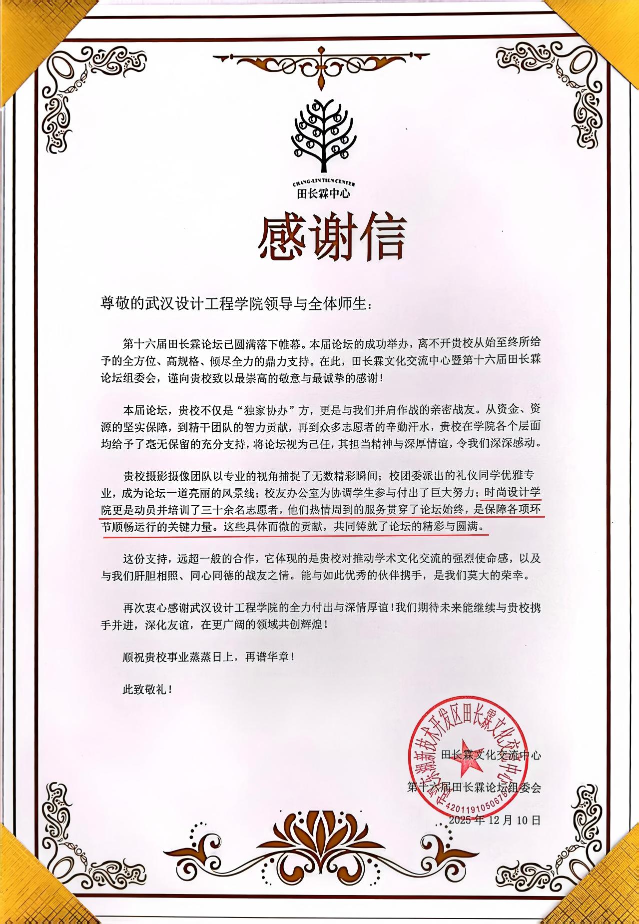 12月26日,田长霖文化交流中心向武汉设计工程学院送达感谢信,并同步为参与“第十六届田长霖论坛暨华侨华人助力产业创新峰会”的各单位志愿者颁发纪念证书。其中,时尚设计学院学子凭借优质服务收获肯定。